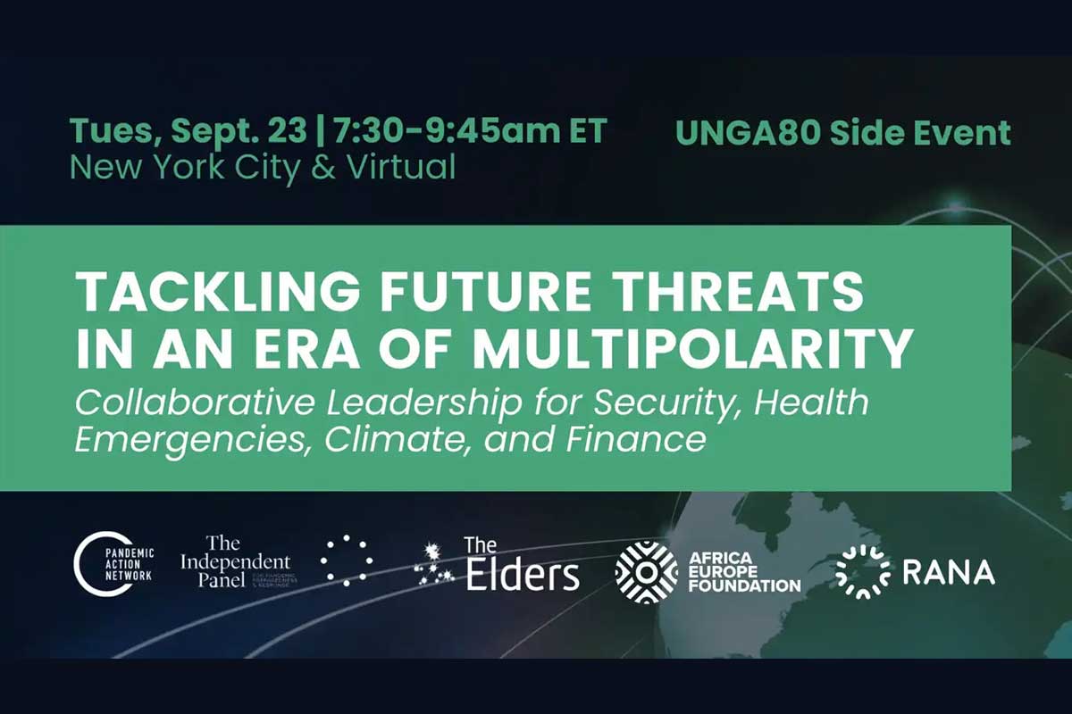 Join Pandemic Action Network (PAN), the Independent Panel for Pandemic Preparedness and Response, The Elders, the Africa-Europe Foundation, and Resilience Action Network Africa (RANA) on Tuesday, Sept. 23, 8:00-9:45am ET, for Tackling Future Threats in an Era of Multipolarity: Collaborative Leadership for Security, Health Emergencies, Climate, and Finance.